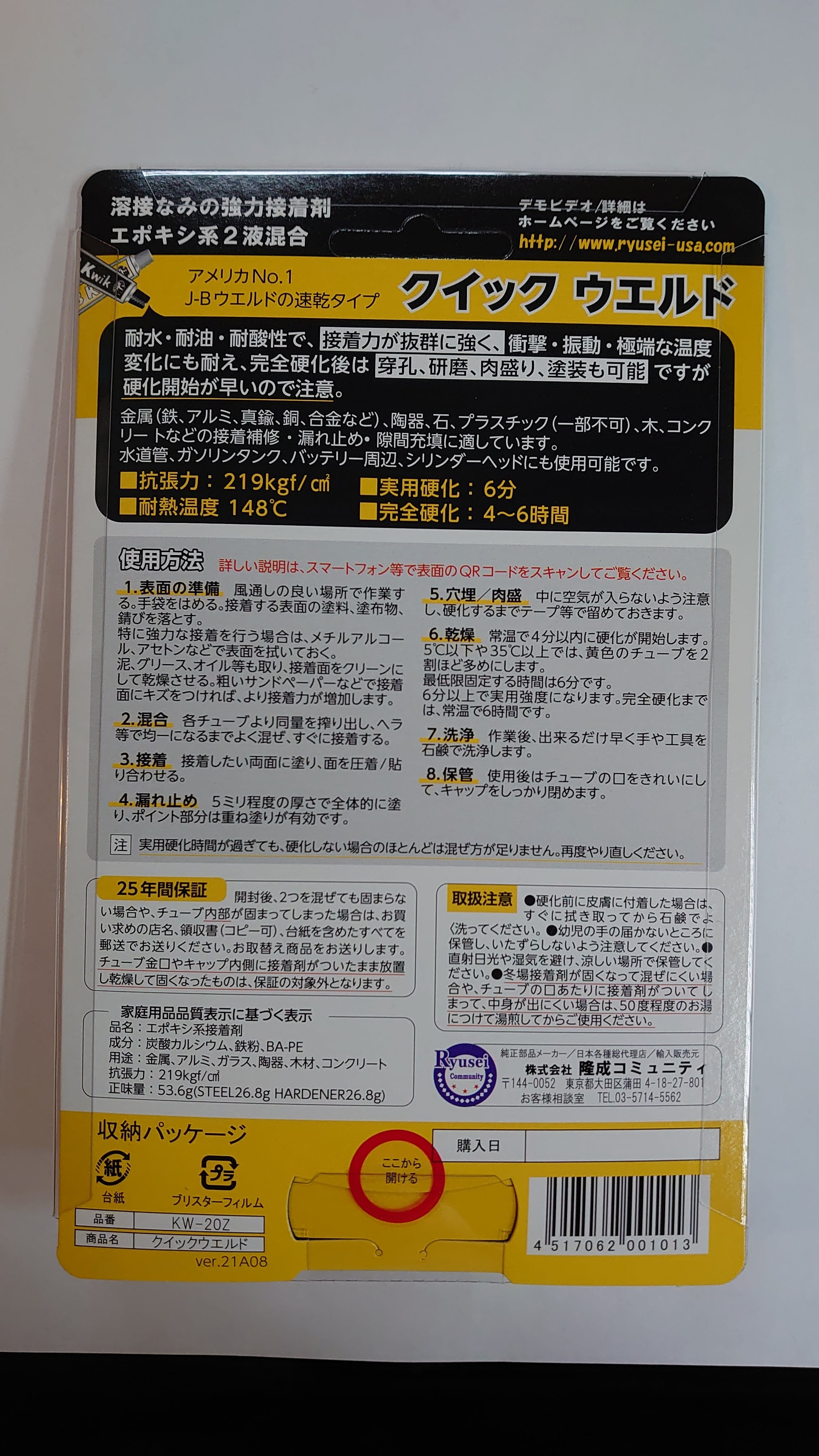 ・実用硬化まで4分間/完全硬化まで20分間(摂氏10度以上)