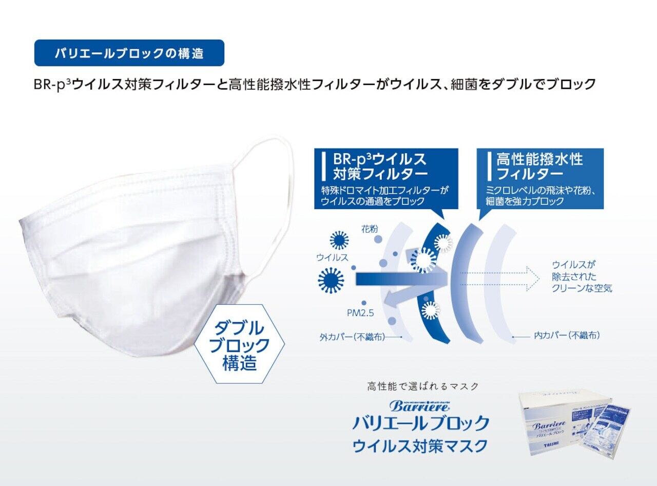 新型コロナをはじめ鳥インフルエンザ、各種インフルエンザのパンデミック対策、花粉や一般細菌の侵入防止、 ウイルス飛沫の拡散防止に。? 抗ウイルスマスク 10枚入り (1枚ずつの個包装) 4層構造の高機能・抗ウイルスマスクです。 ウイルス飛沫・細菌・花粉などの侵入を防ぎます。 特殊ドロマイト(BR-p3)抗菌加工フィルターを使用しており、日本の特許も取得済。 パッケージには日本語と英語が併記されています。 1枚ずつ個包装になっていて備蓄にも適しています。 (バリエール 抗ウィルスマスク 5枚セット)